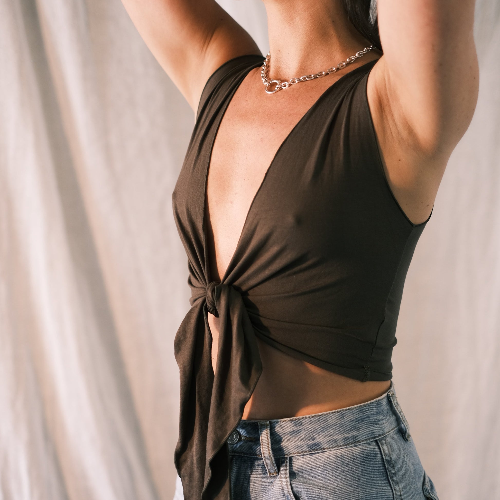 - With its bold tie front & hand cut/woven embroidery back, the VIPER TANK is a statement of confidence and self expression.